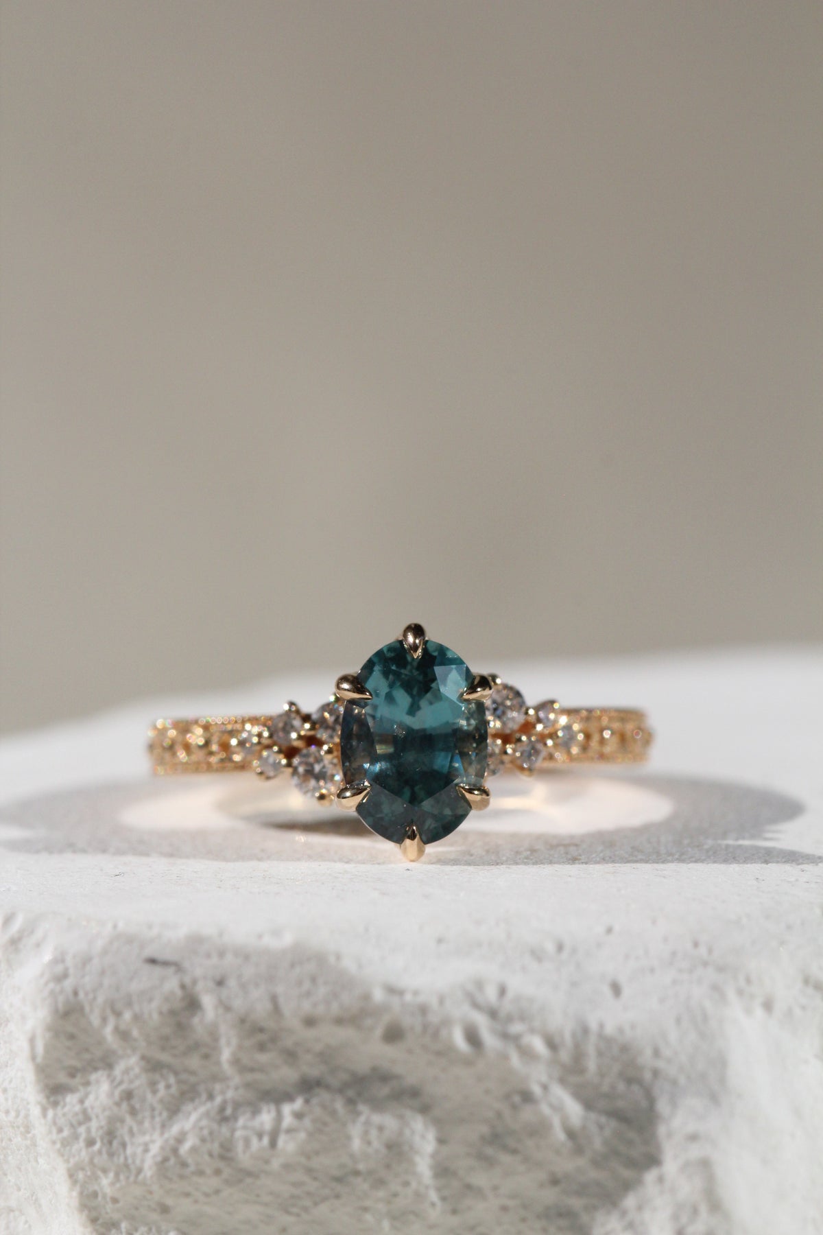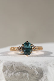 This ring features an ethically sourced teal Montana sapphire, embraced within our signature Latticework Petal Prongs; flutes of golden petals woven together for both elegant beauty and strength.