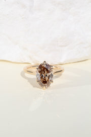 A warm embrace of golden tones; a rare honey colored old mine oval lab diamond rests within our woven Latticework Petal Prongs. Its antique inspired facets dance with flecks of bronze, gold, and caramel tones.